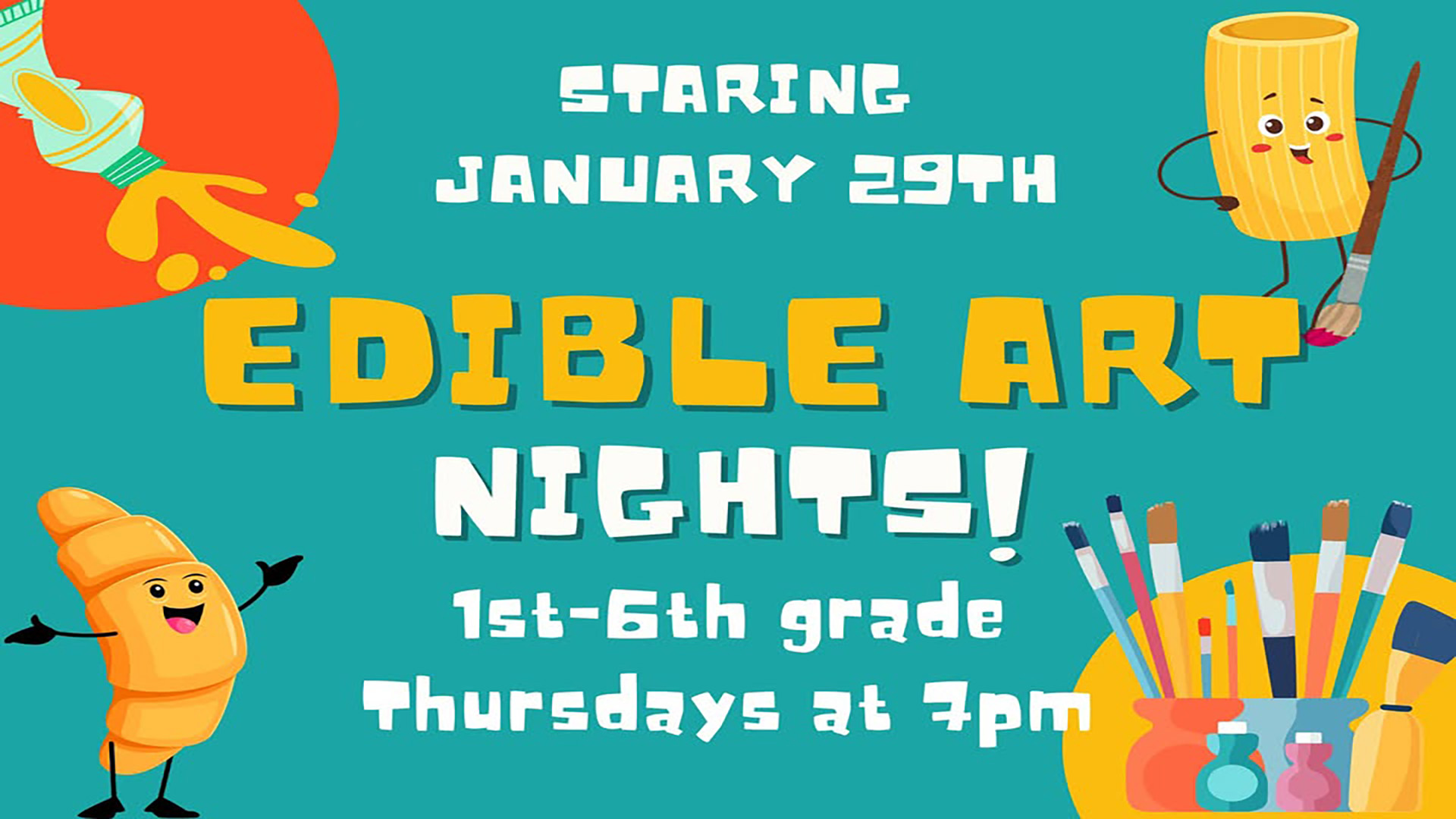 Get ready for 9 weeks of hands-on creativity that you can eat! Edible Art Nights happen every Thursday from January 29–March 26, 7:00 PM–8:30 PM, and are designed for kids in grades 1–6 — boys and girls welcome!