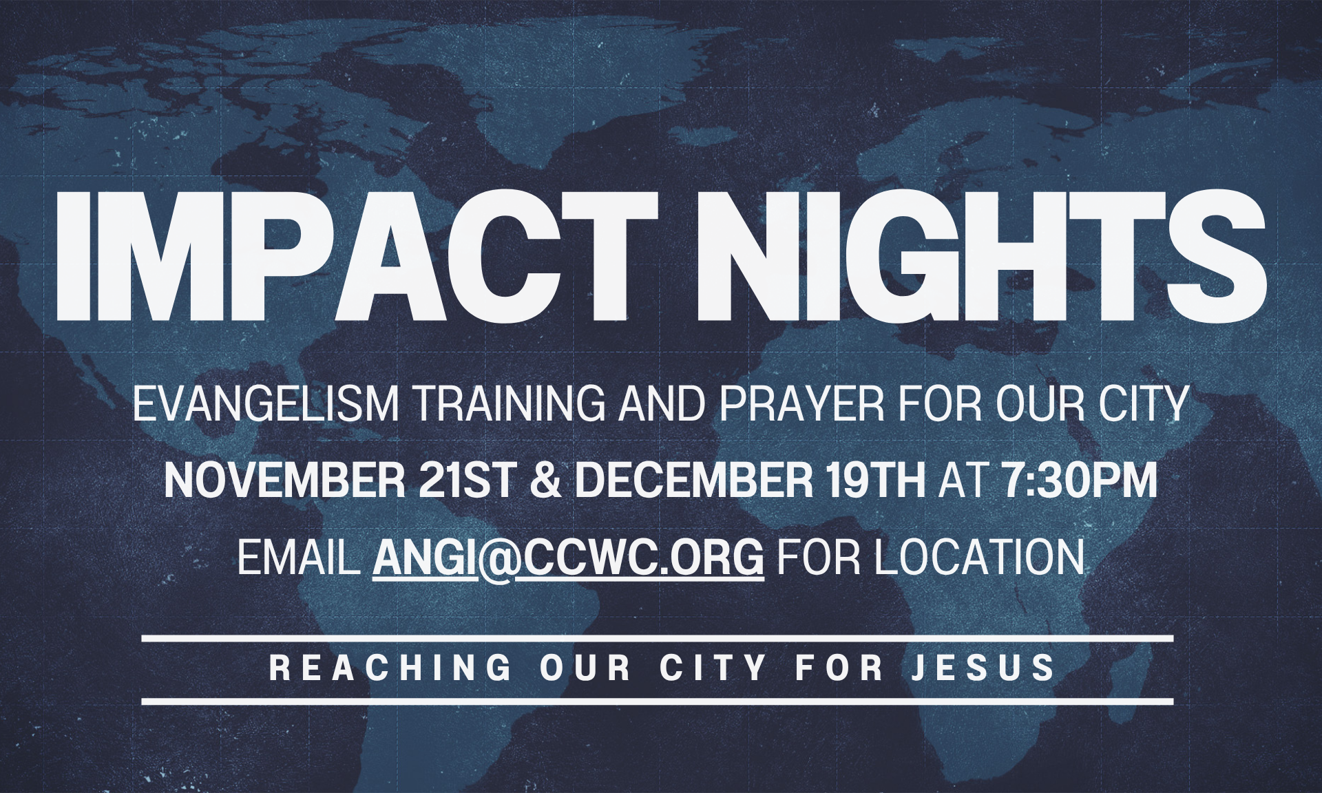 Evangelism training and prayer for out city. November 21st and December 19th @ 7:30. For more information email Angi. angi@ccwc.org. Reaching our city for Jesus